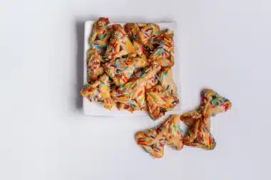 אוזני המן צבעוניות וחגיגיות במיוחד, מבצק פריך משולב סוכריות צבעוניות, במילוי שוקולד עשיר ונמס בפה.