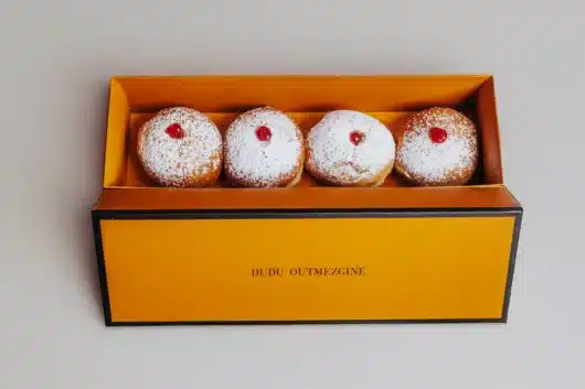4 סופגניות איכותיות מבצק בריוש עשיר בחמאה ובחלב במילוי: קרם פטיסייר וריבה איכותית, ארוזות בקופסא מהודרת ויוקרתית